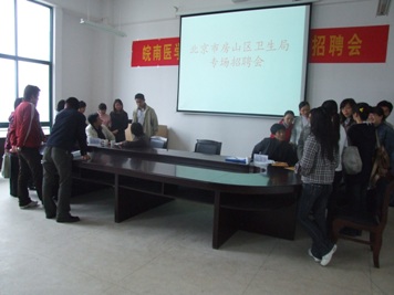 4月11日,北京市房山区人事局、卫生局带领房山区妇幼保健院、燕山社区卫生服务中心及房山区下属石楼镇等7个社区卫生服务中心在我校大学生活动中心多功能会议厅举行了专场招聘会。校党委书记卞国忠亲临会场与北京市房山区卫生局负责人亲切交谈,并就举办专场招聘会进行了现场指导。
