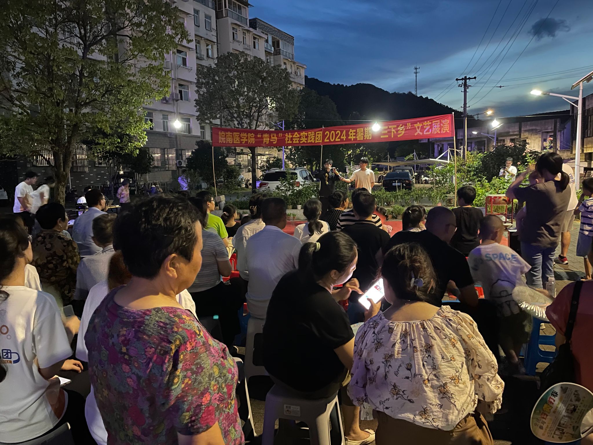 8日上午9点整,实践团全员整队出发,历经3个多小时的车程抵达石台县,便顶着烈日骄阳马不停蹄地开始布置场地、彩排节目。晚上的正式演出吸引了百余名村民前来观看。唯美动人的开场舞《如愿》饱含了学子对革命先辈的敬意与怀念,接地气的三句半《二十大指引新航程》让党的二十大精神“声入人心”。竹笛演奏《扬鞭催马运粮忙》、舞蹈《皖医夏天》、小合唱《相亲相爱》、古典舞《国风古韵》、大合唱《我和我的祖国》……现场气氛热烈欢腾,不时爆发出热烈的掌声和欢呼声。互动环节“绕口令大比拼”“红歌来识曲”更是得到了在场村民的踊跃参与。最后,本场展演在百人齐跳广场舞《奢香夫人》中圆满落下帷幕。村民李大爷感叹道:“感觉还没看够呢,村里过年都没这么热闹,大学生来了就是好,真好!”