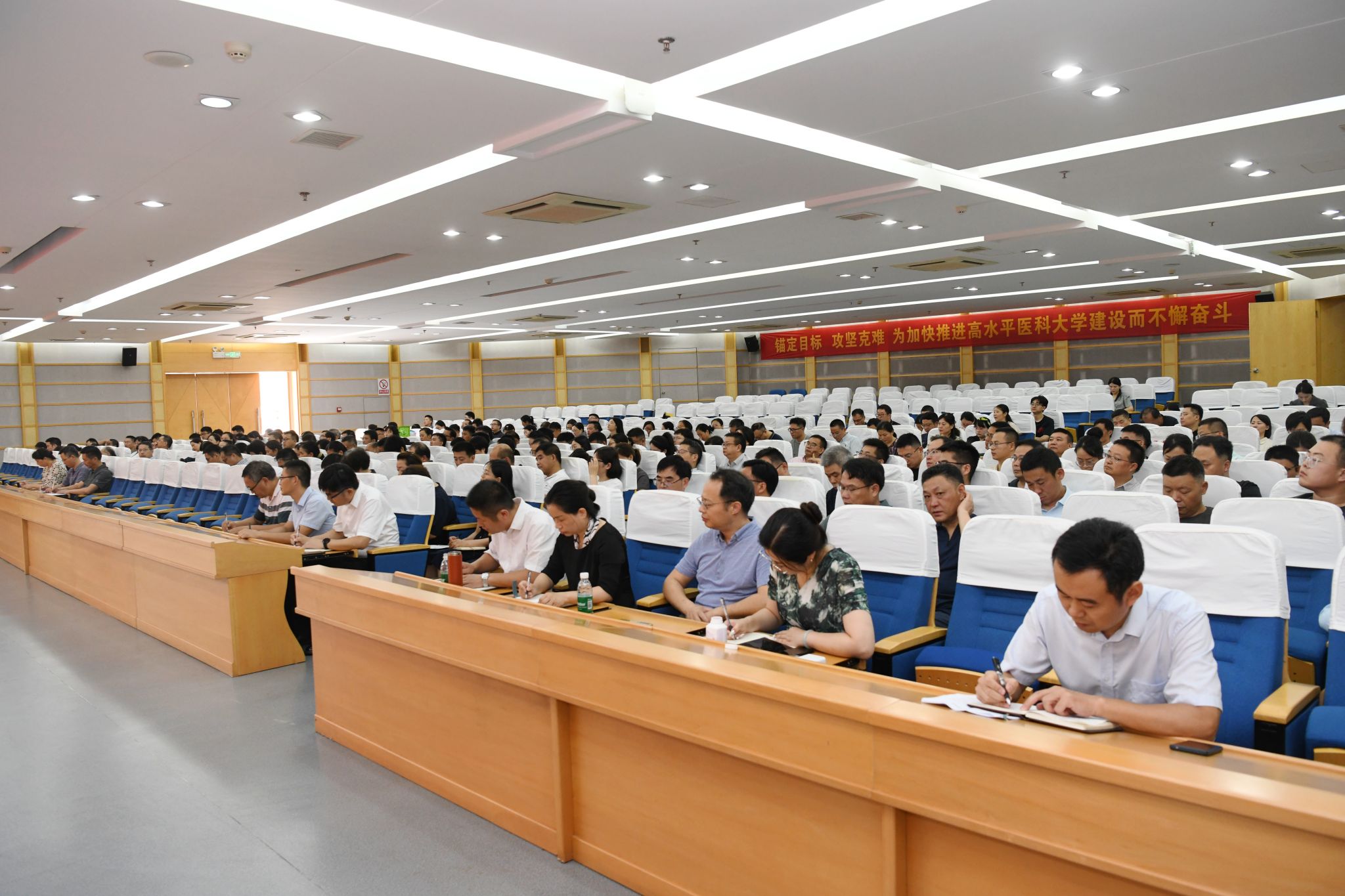 学校全体处级干部、教研室主任、校本部教授、博士、附属医院分管教学副院长和教学职能部门负责人参加会议。(何丽/文 侯东晓/摄)