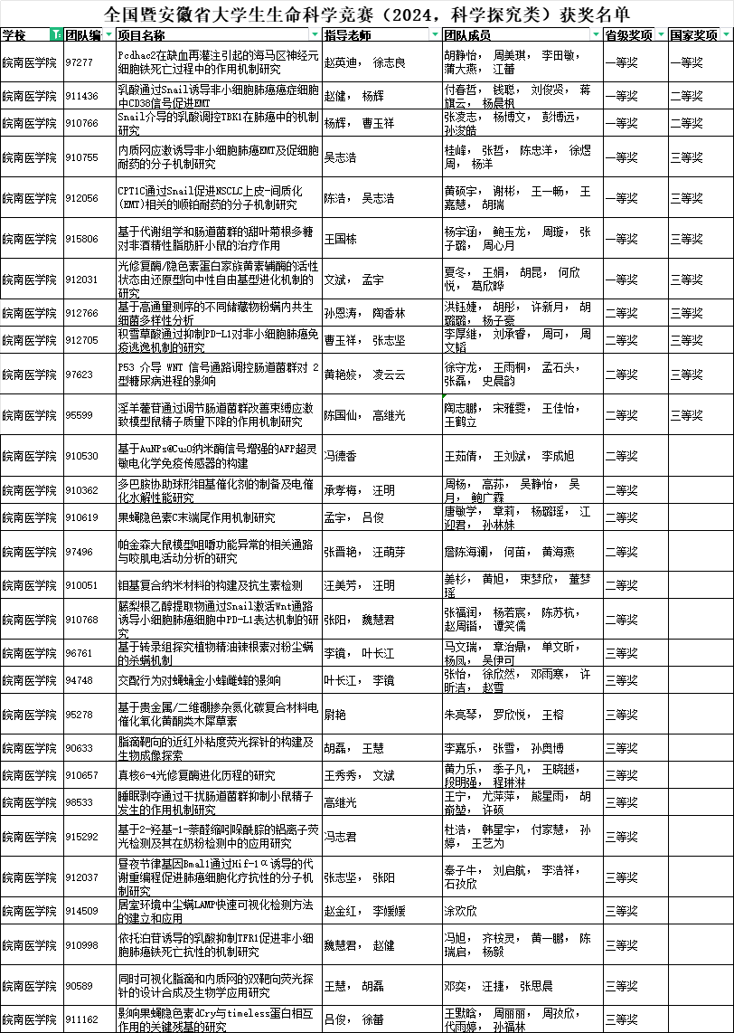 本项赛事分为省赛和国赛两个阶段。省赛于2023年10月正式启动,由安徽省教育厅主办、安徽师范大学协办,共有省内26所学校的741个团队参加比赛。经过参赛队伍提交立项报告、上传实验记录到完成论文,再经过网评,最终评出144项队伍进入决赛。进入决赛的项目通过现场答辩最终评出一、二、三等奖。我校共有56个团队参加省赛,最终获奖29项,其中3个团队被推荐参加第九届全国大学生生命科学竞赛(科学探究类)决赛。最终,我校基础医学院人体解剖学教研室赵英迪和徐志良老师带领的学生团队获得国赛一等奖,另外两个团队获得国赛二等奖。