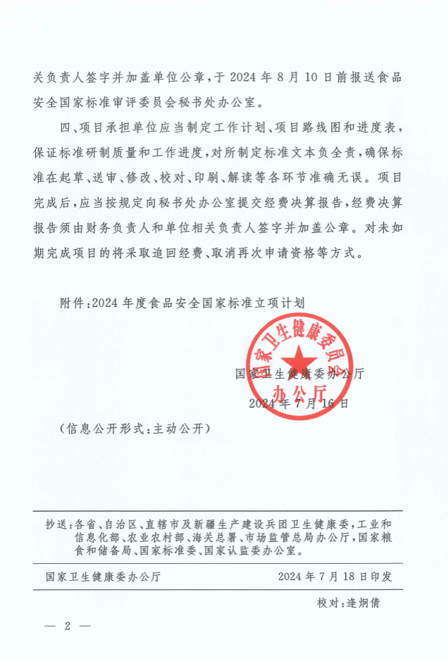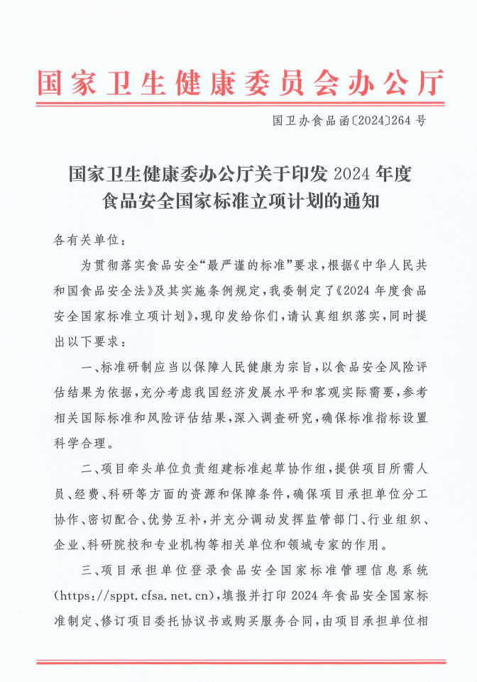 7月29日,食品安全标准与监测评估司正式发布《国家卫生健康委办公厅关于印发2024年度食品安全国家标准立项计划的通知》,由多家单位联合主持的共35项食品安全国家标准正式立项。其中,我校作为第五单位共同主持《食品添加剂 淀粉磷酸酯钠》和《食品添加剂 磷酸酯双淀粉》两项国家标准的制修订工作。
