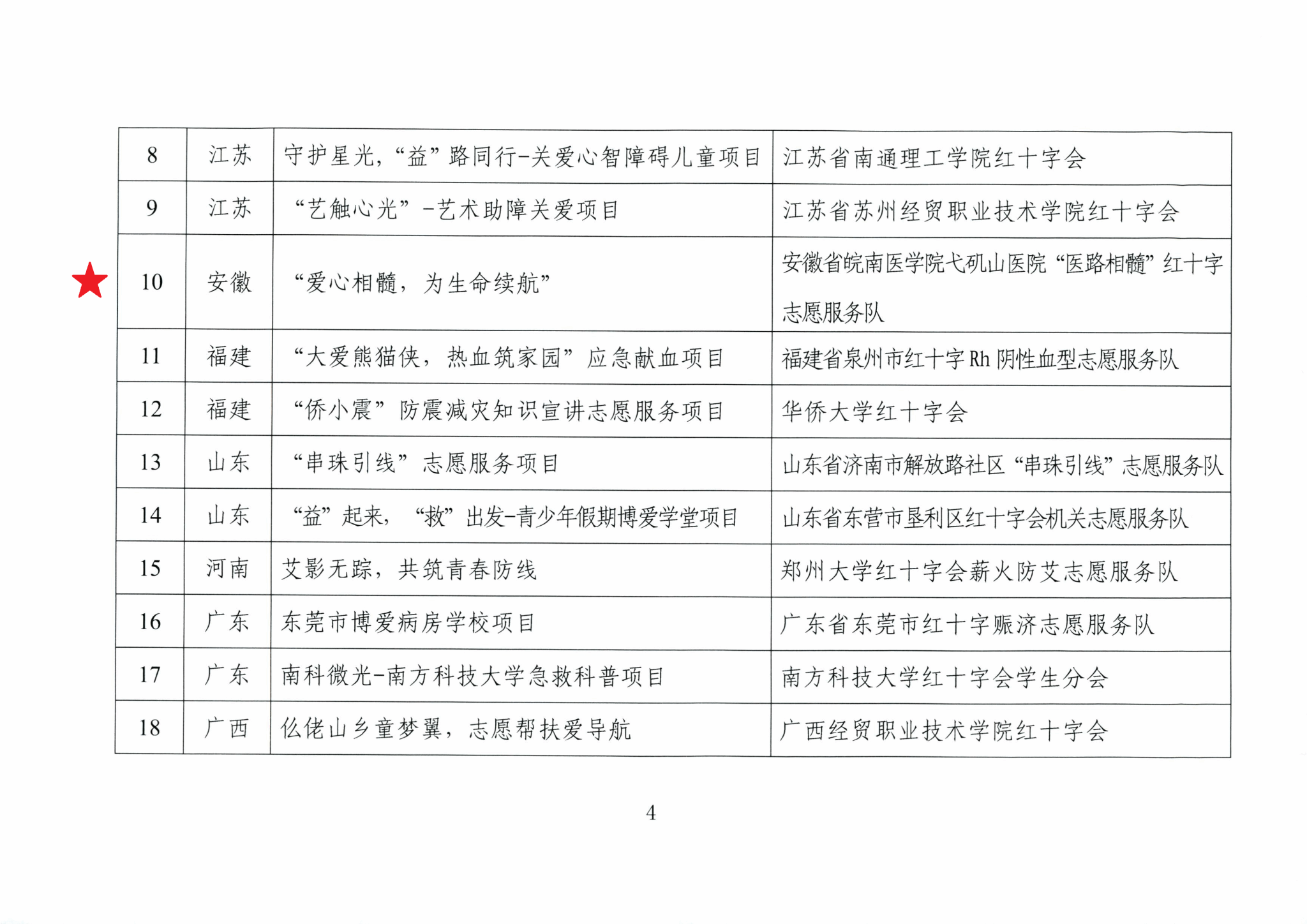 近日,中国红十字会总会第十四期红十字志愿服务项目发展计划立项名单公布,我校“爱心相髓,为生命续航”造血干细胞科普宣讲暨捐献志愿服务项目成功入选。此次红十字志愿服务项目发展计划以生命教育为主题,践行“保护人的生命和健康”的红十字会宗旨,弘扬“人道、博爱、奉献”的红十字精神,从全国各省级红十字会推选的志愿服务项目中遴选出25个项目加以支持,我校“爱心相髓,为生命续航”志愿服务项目为安徽省唯一入选项目,全国仅6所本科院校项目入选
