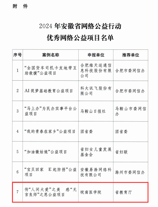 近日,安徽省委网信办公布了2024年安徽省网络公益行动优秀网络公益项目名单,全省共有15个项目受到表扬。其中,我校遗体捐献接受站“传‘人间大爱’之美·感‘无言良师’之恩”公益项目成功入选,这也是安徽省教育系统唯一入选项目。