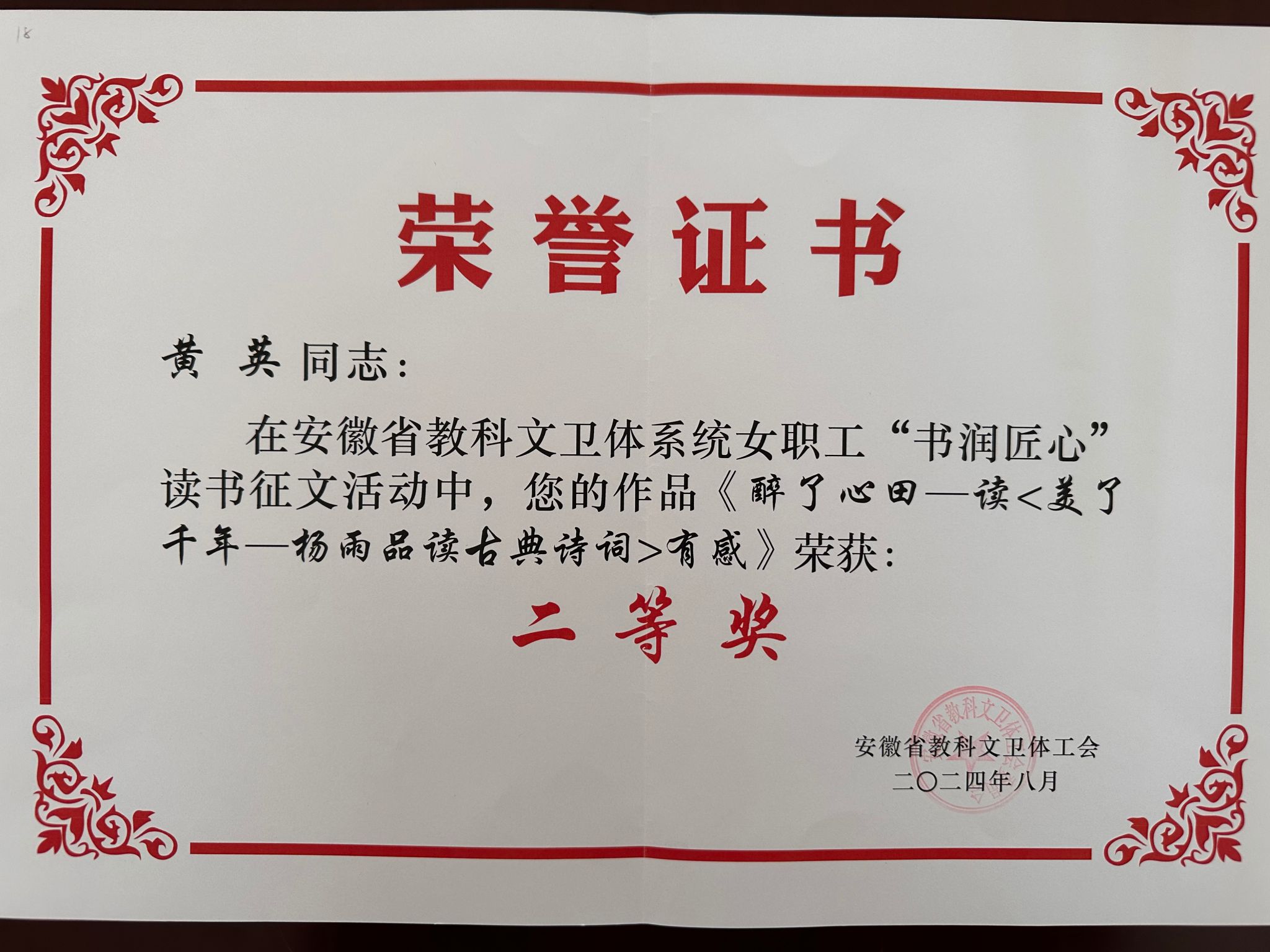 为持续加强女教职工思想政治引领,展现女教职工风采,进一步激励广大女教职工立足岗位、奋力拼搏,我校积极组织女教职工参加省教科文卫体系统女职工“书润匠心”读书征文活动。近日,活动结果公布,我校黄英老师的《醉了心田——读< 美了千年—杨雨品读古典诗词>有感》获二等奖,校工会获优秀组织单位。