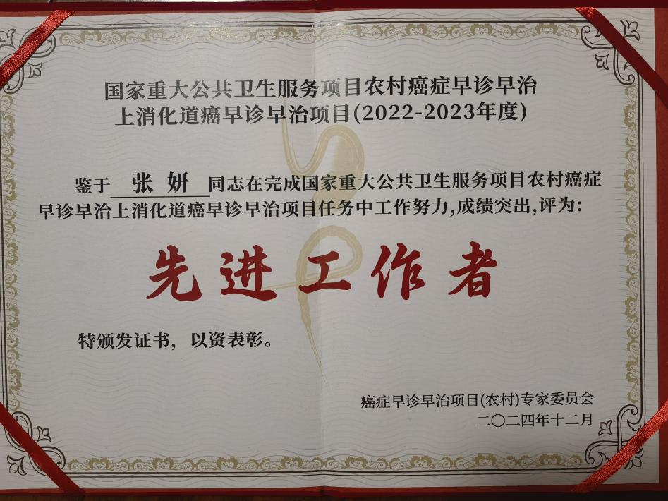 近日,由中国癌症基金会主办,国家癌症中心、中国医学科学院肿瘤医院承办的上消化道癌早诊早治项目(农村)技术培训与项目总结大会暨第八届北京国际消化道肿瘤早期诊断与早期治疗研讨会在北京召开。会上,我校第一附属医院获评国家重大公共卫生服务项目农村癌症早诊早治上消化道癌早诊早治项目(2022—2023年度)“优秀项目单位”,消化内科张妍获评“先进工作者”。