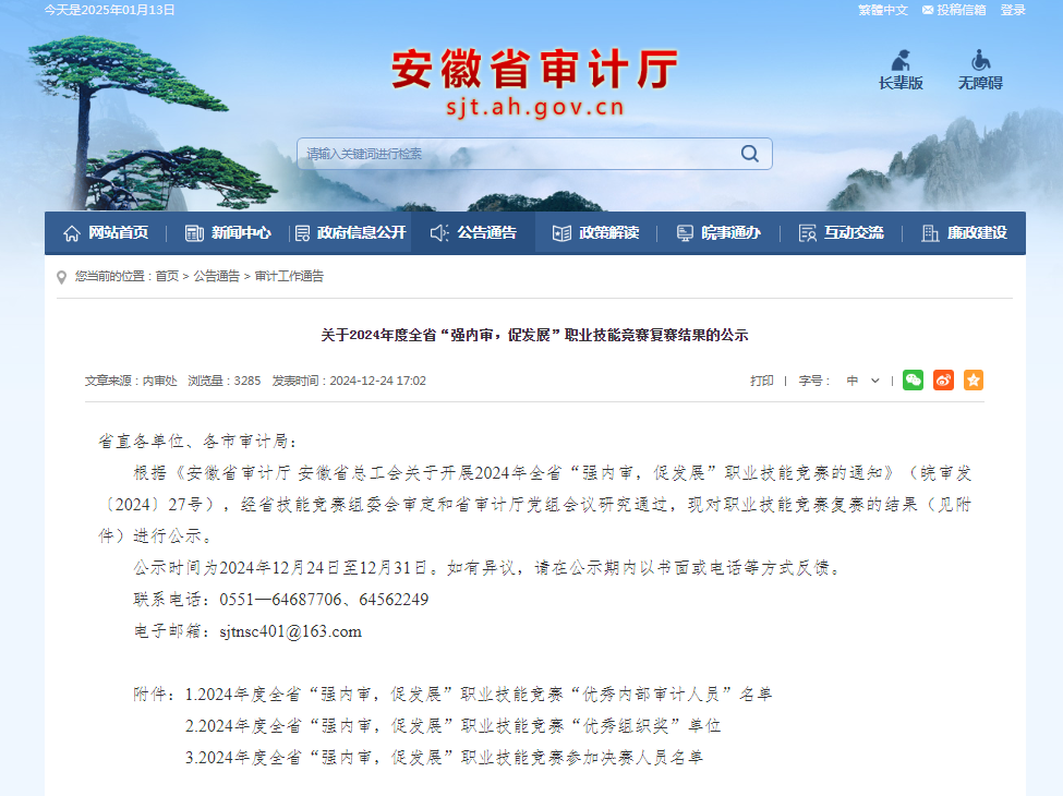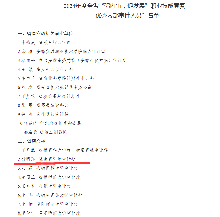日前,安徽省总工会、审计厅通报2024年全省“强内审,促发展”职业技能竞赛复赛结果,我校审计处舒明洋同志获“优秀内部审计人员”荣誉称号。