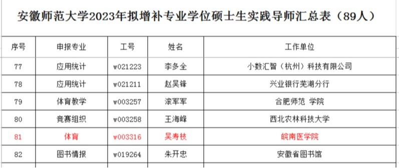 学校1名体育教师获得安徽师范大学硕士生导师资格,开创了我校体育学科研究生带教的先河,也为体育教师提供了更高层次的学术交流平台。为拓展体育学科的学术领域和实践应用,学校积极申报运动康复专业。此外,去年成功引进1名博士研究生,体育教研室教师共发表一类高水平论文8篇。