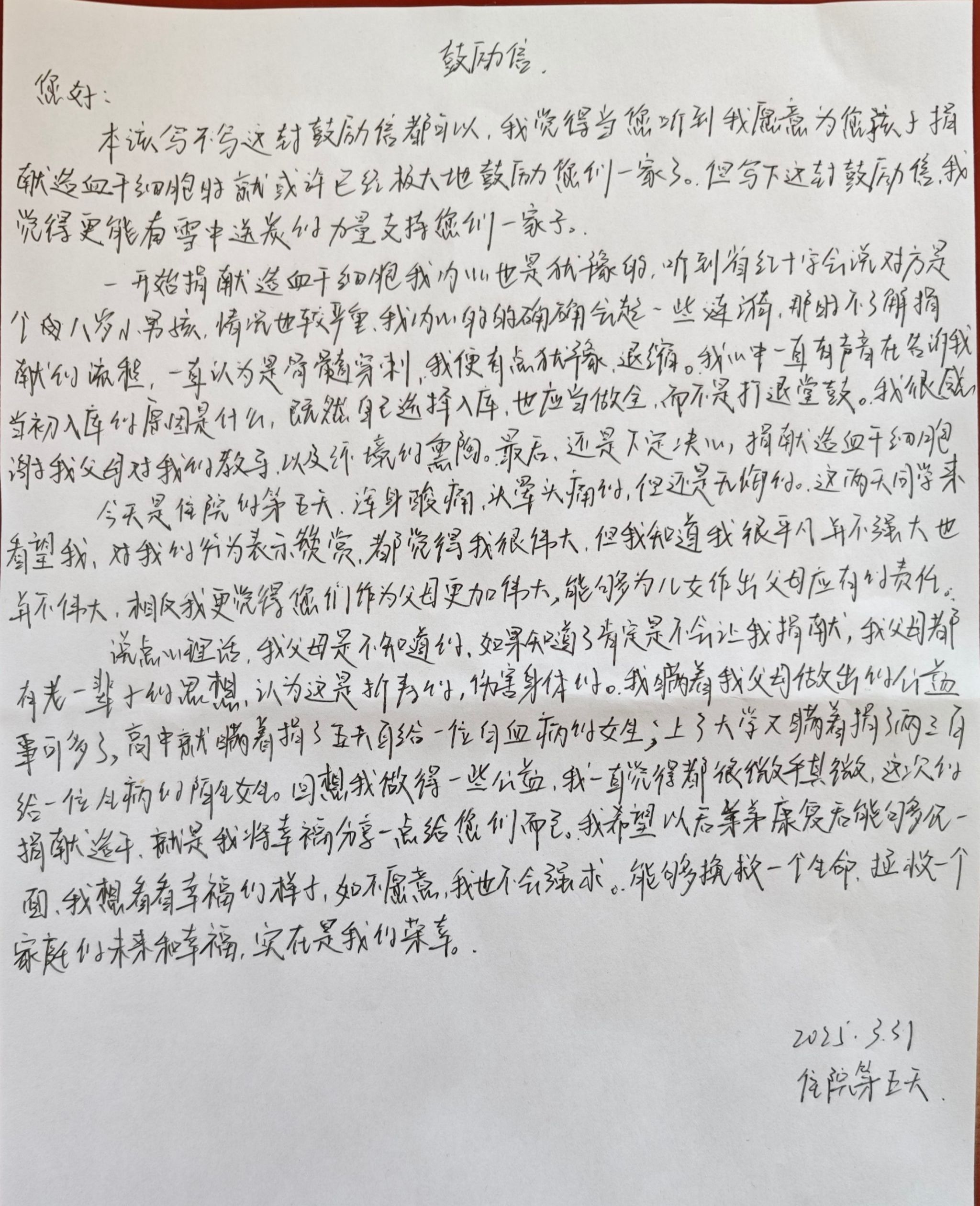 捐赠期间,患者家属满怀感恩之情写下感谢信,并通过医护人员转交到病房。在看完感谢信,杨坤同学第一时间给患者家属回信,“能够用自己的力量挽救一条生命,是我觉得最有意义的事。”杨坤表示,希望通过自己的行动,让更多人了解造血干细胞捐献,鼓励更多爱心人士加入中华骨髓库,为更多血液病患者带来生的希望 。班级同学们都称赞他:“杨坤同学用自己的行动展现了新时代医学生无私奉献的精神和应有的担当,为我们全体同学树立了榜样。”