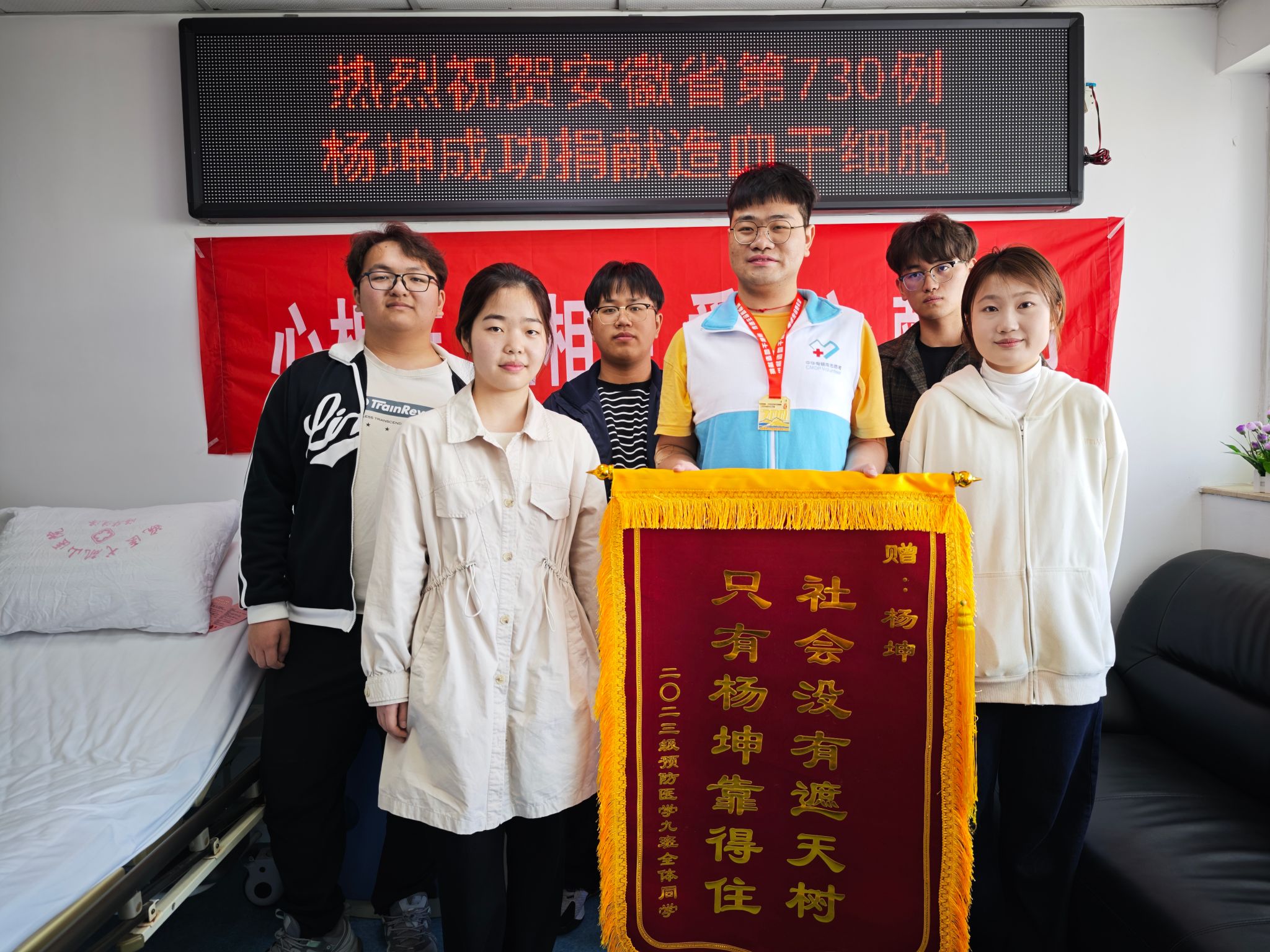杨坤同学为素不相识的病患捐献造血干细胞,这一善举不仅彰显了个人关爱他人、勇于担当的高尚品德,更是我校“精医、尚德、求实、自强”校训的生动体现。一直以来,学校坚持落实立德树人根本任务,把思想政治工作贯穿教育教学全过程,大力弘扬医学人文精神,努力培养有情怀、有大爱、有温度、有技艺“德医双馨”的新时代医学生。相信在未来,将有更多皖医学子投身到爱心接力中,传递温暖、点亮希望,用实际行动践行青年的责任与担当,以无私奉献为青春留下最美的注脚。(陈乔溪、华龙/文  梁梦琴、华龙/摄)