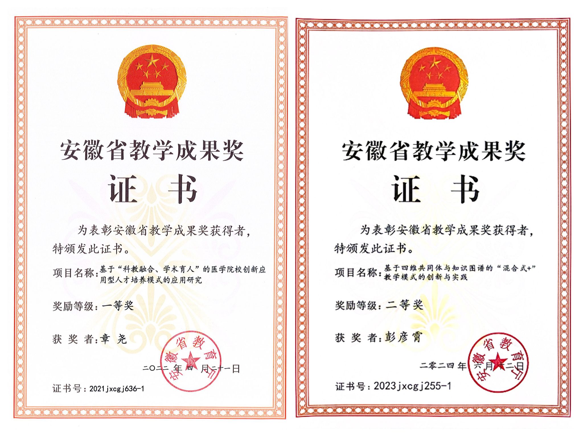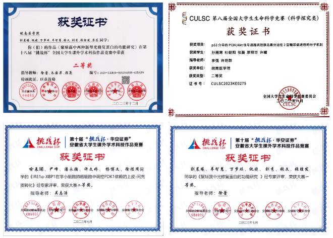 学生培养成果丰硕,2018年以来,基础医学院先后指导500余名本科生发表科研论文120余篇,其中SCI论文30余篇;获批省级以上创新创业训练项目、科研项目等160余项,其中国家级54项;指导大学生获省级以上奖项40余项,其中国家级10项。获“挑战杯”全国大学生课外学术科技作品竞赛国家级二等奖1项、三等奖11项,“互联网+”大学生创新创业大赛国赛三等奖3项,全国大学生生命科学竞赛二等奖1项、三等奖9项。指导大学生获省级以上奖项40余项,其中国家级20余项。指导学生获全国医学生解剖绘图大赛特等奖、全国青年志愿者服务大赛金奖、全国第七届高校廉洁教育活动公益广告作品表演艺术类精品项目、全国首届形态学科普美文比赛三等奖、第七届中国大学生生化歌曲大赛一等奖等。培养的学生作为安徽省唯一一名在校本科生代表参加中国红十字会第十二次全国会员代表大会。