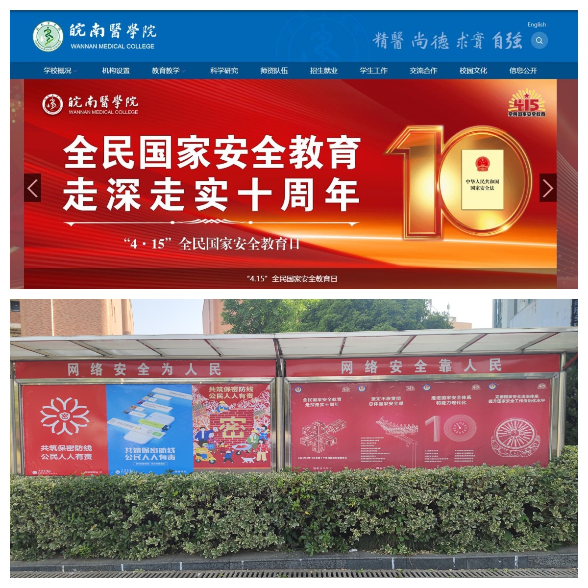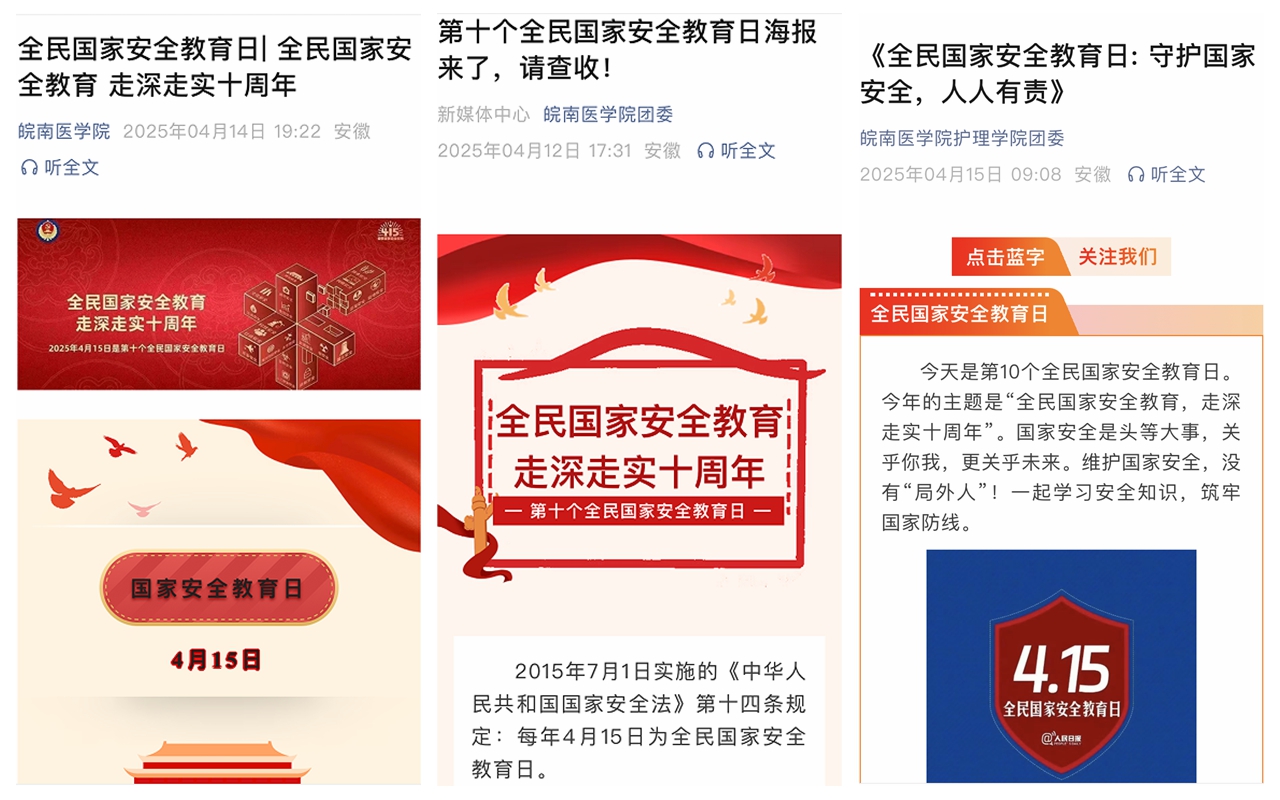 顶层设计推动任务落实。学校第一时间发布《关于开展2025年全民国家安全教育日活动的通知》,明确各部门责任与任务,将安全教育活动与平安校园建设、爱国主义教育、法治宣传、反间防谍反诈骗等有机结合,确保活动顺利推进。各部门和单位通过部门网站、微信、QQ 等平台及时推送总体国家安全观和全民国家安全教育日的相关知识及宣传标语,营造浓厚校园安全氛围。