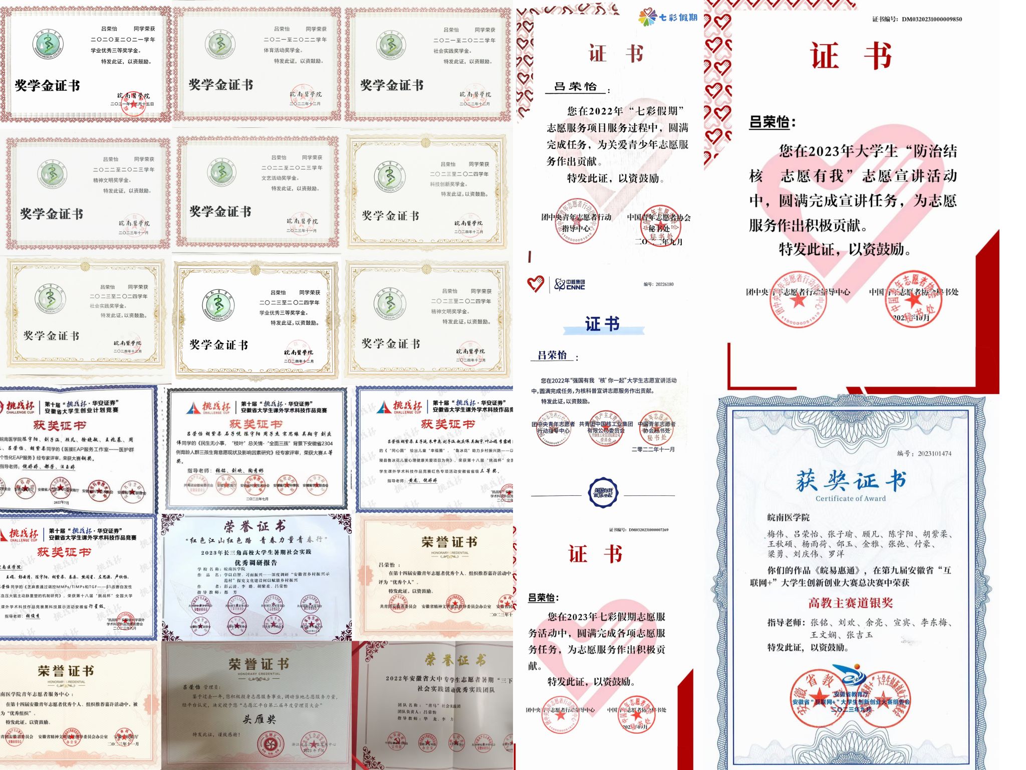 知行合一启新思,科创育才结硕果。在校期间,吕荣怡深刻感悟志愿服务的育人功能,结合服务经历,躬身社会调研,投身科技创新,曾获长三角高校大学生暑期优秀调研报告,安徽省“挑战杯”系列竞赛银奖1项、铜奖3项,安徽省“互联网+”创新创业大赛银奖1项,同时获批省级大学生创新创业训练计划项目。本人累计获得国家级荣誉5项、省级荣誉10余项、校级荣誉40余项。
