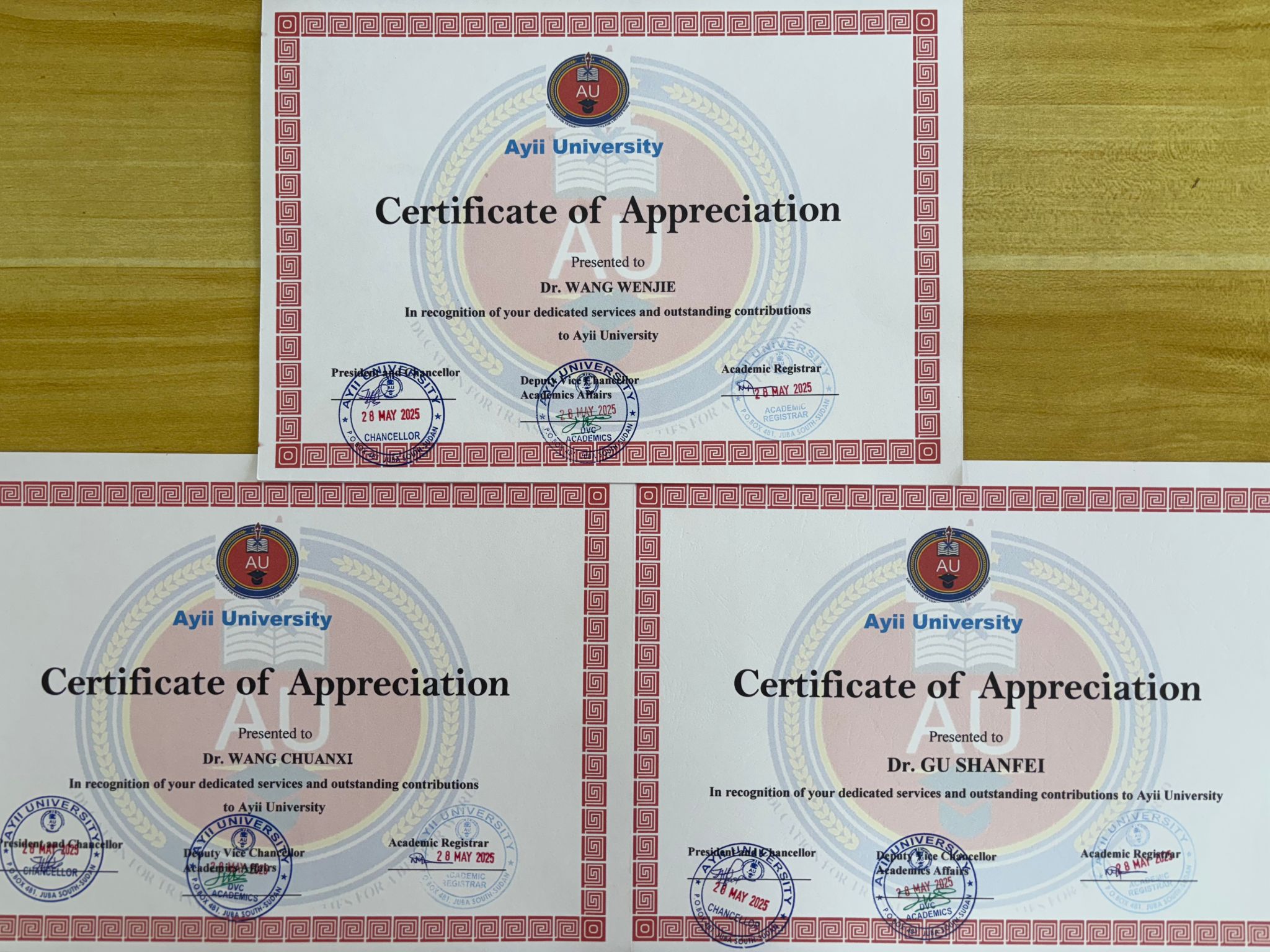 授课期间,师生紧密互动,现场气氛热烈,取得了良好的教学效果,阿伊大学学子纷纷表示受益匪浅。培训结束后,南苏丹阿伊大学医学院院长 Isaac Ayii Madut向中国(安徽)第十二批援南苏丹医疗队3名队员表示了衷心感谢,赞扬了他们严谨的教学态度和良好的专业素养,并向他们颁发了荣誉证书。王文节/文、供图