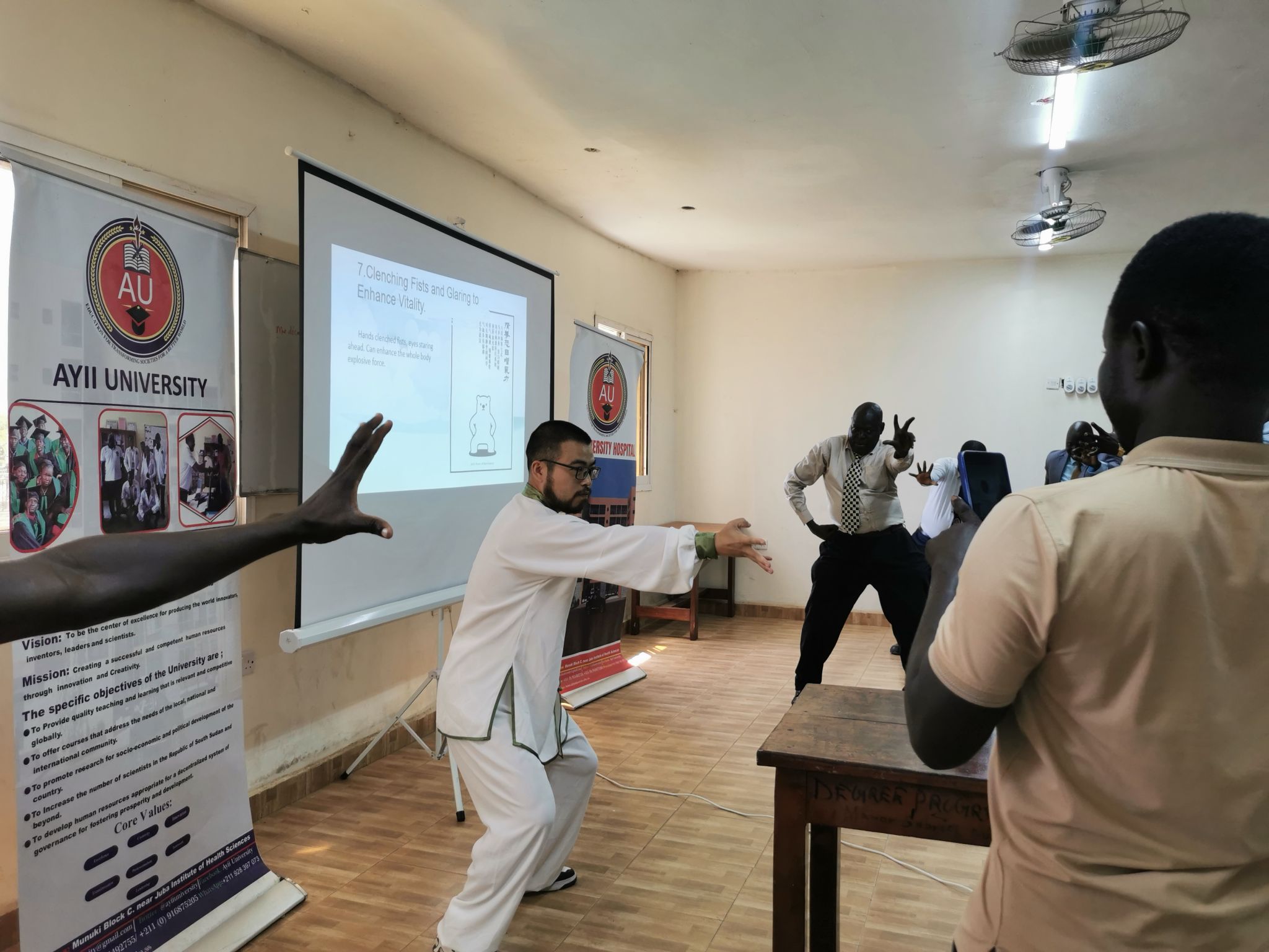 近日,受南苏丹阿伊大学医学院邀请,中国(安徽)第十二批援南苏丹医疗队队员、来自我校第一附属医院的王文节、王传喜、谷绍飞走进阿伊大学校园,为该校师生开展为期三个月的医学教学活动。3名医疗队员立足本专业,精心准备课程,通过理论讲解、实践操作、案例分析、情景展现等方式讲授医学知识,传播先进医学理念。