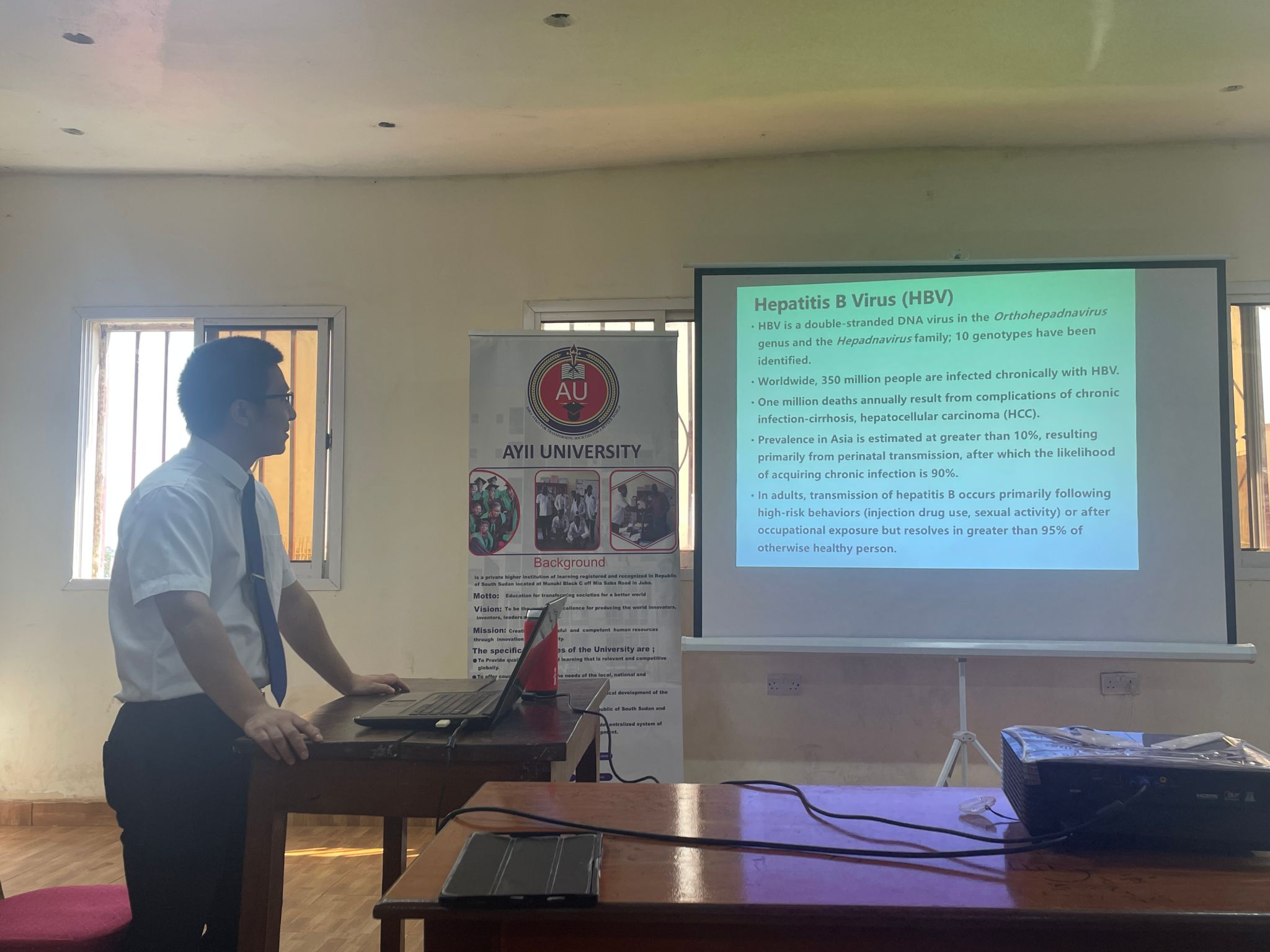 第一附属医院感染性疾病科副主任医师王文节针对南苏丹当地疾病特点,讲解了传染性疾病防治策略,重点从不同类型病毒性肝炎的流行病学特点入手,结合临床典型病例,向师生们讲解了五种常见病毒性肝炎的临床表现、诊断、治疗及预防措施,强调了抗病毒治疗在乙型及丙型病毒性肝炎治疗中的重要性。