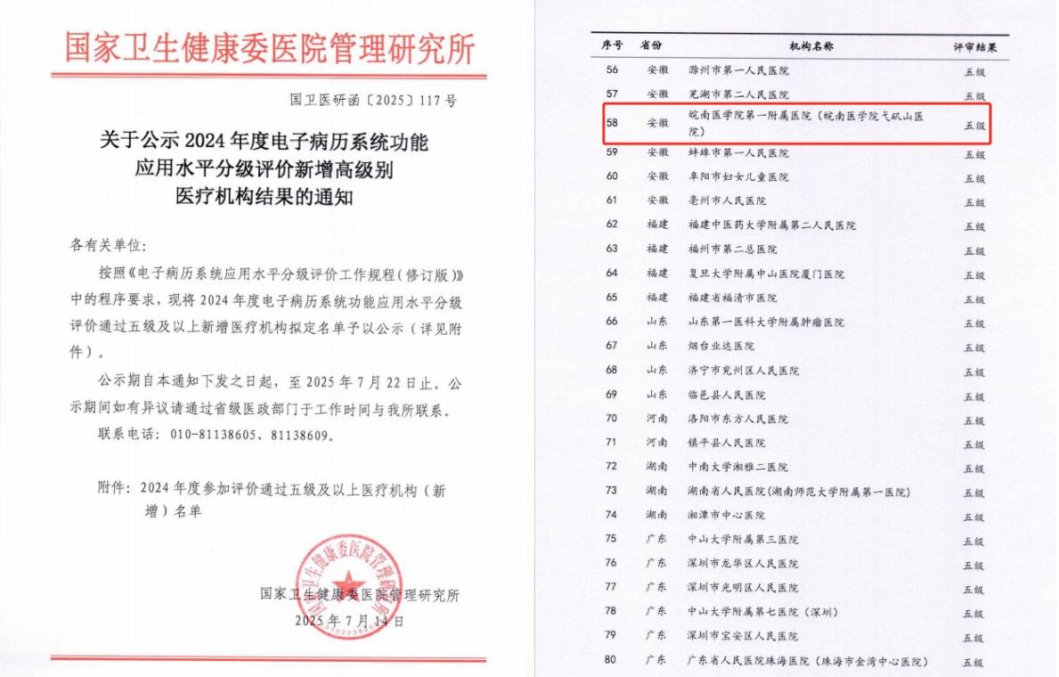 近日,国家卫生健康委医院管理研究所公布2024年度电子病历系统功能应用水平分级评价结果,我校第一附属医院电子病历应用水平分级评价通过国家五级评审,标志着医院信息化建设水平迈上新台阶。