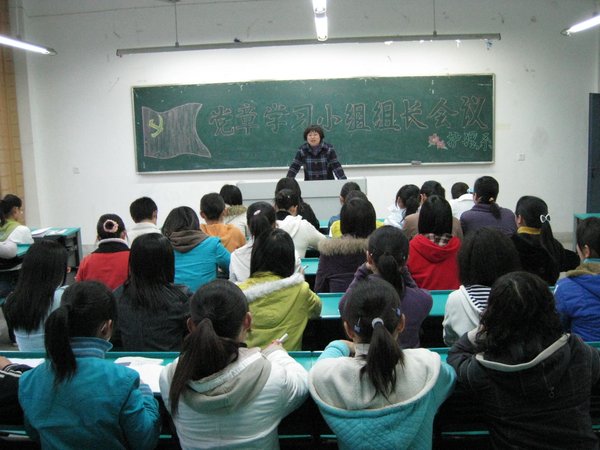 3月19日晚六点,护理学系党章学习小组组长会议在西教学楼108教室召开。此次会议由护理学系党总支委员、学生党支部书记王雪琴老师主持,34名党章学习小组组长参加会议。 王老师介绍了党章学习小组的制度,详细阐明成立党章学习小组的必要性和党章学习活动的重要性,她指出:通过党章学习小组开展各种活动,有助于同学明确入党动机,提升自身政治素质,有助于创建我系良好的政治理论学习氛围! 接下来,王老师结合“十七大”报告和当前时事,进一步宣传了中国共产党全心全意为人民服务的宗旨,启发大家树立正确的人生信念,鼓励同学们积极向党组织靠拢;关心社会,将自身专业与社会发展相结合,与时俱进,适应社会的发展。 最后各组长明确了自身职责,表示一定尽力做好这项工作,发挥党章学习小组的作用,加强学生政治理论学习  会议现场