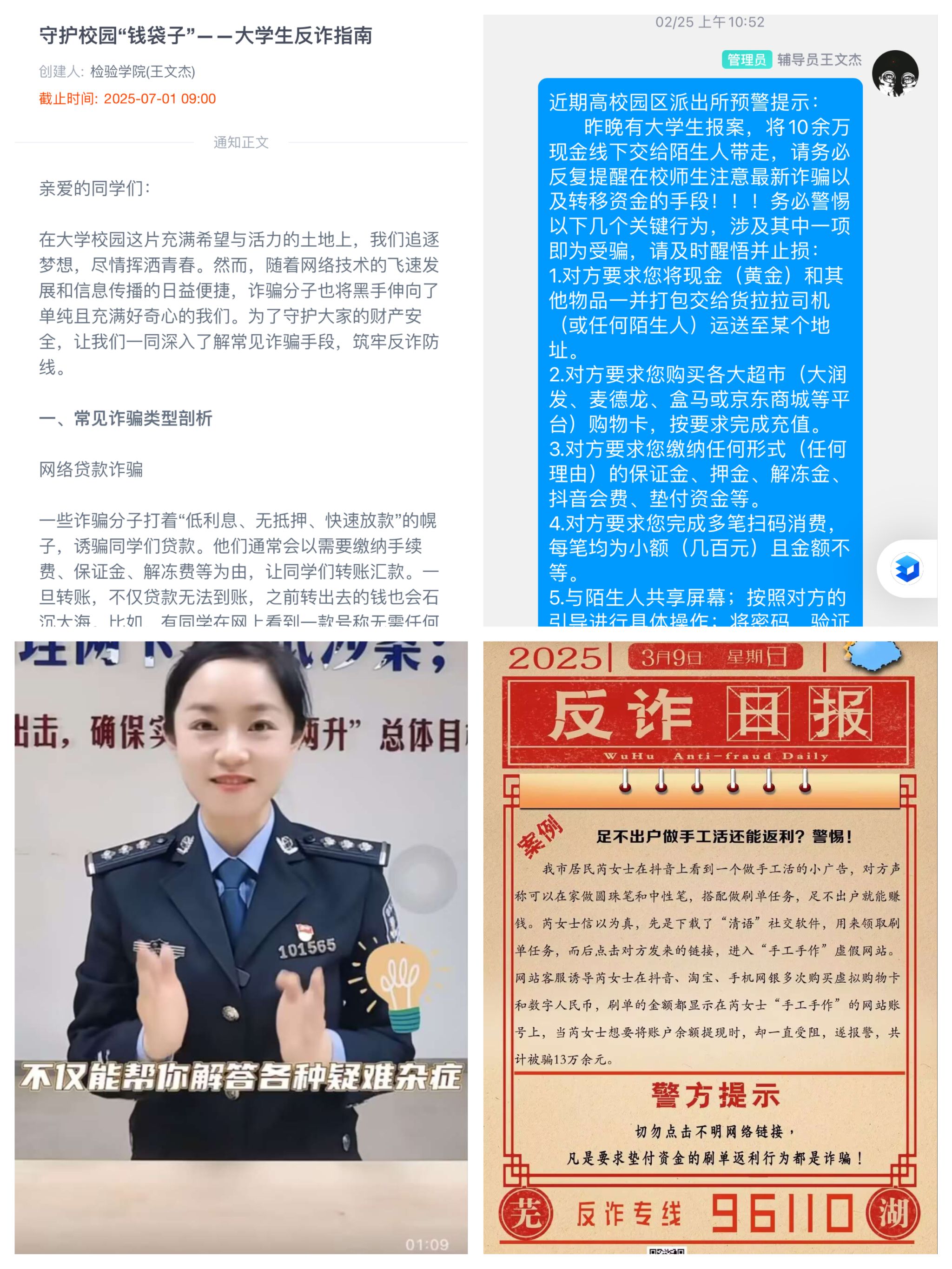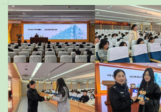 3月20日下午,保卫处、检验学院联合弋江公安分局高校园区派出所为检验学院全体学生作“反诈宣传教育”主题讲座,公安反诈民警古丽警官担任主讲,保卫处副处长魏巍,检验学院领导、辅导员和兼职班主任参加讲座。本次讲座围绕常见诈骗手段的识别技巧及应对策略展开,通过真实案例还原诈骗场景,帮助学生掌握防范技能。反诈民警结合实际案例,深入剖析了常见的诈骗手段和作案特点,如网络刷单、虚假网贷、冒充公检法诈骗等,并详细讲解了应对方法和防范措施,提醒同学们要做到“不听、不信、不转账”,遇到可疑情况及时与老师、家长沟通或拨打报警电话。同学们认真倾听,积极互动,现场气氛热烈。通过警校联动,既提升了反诈宣传的专业性,也体现了学院对学生切身利益的关心关切。