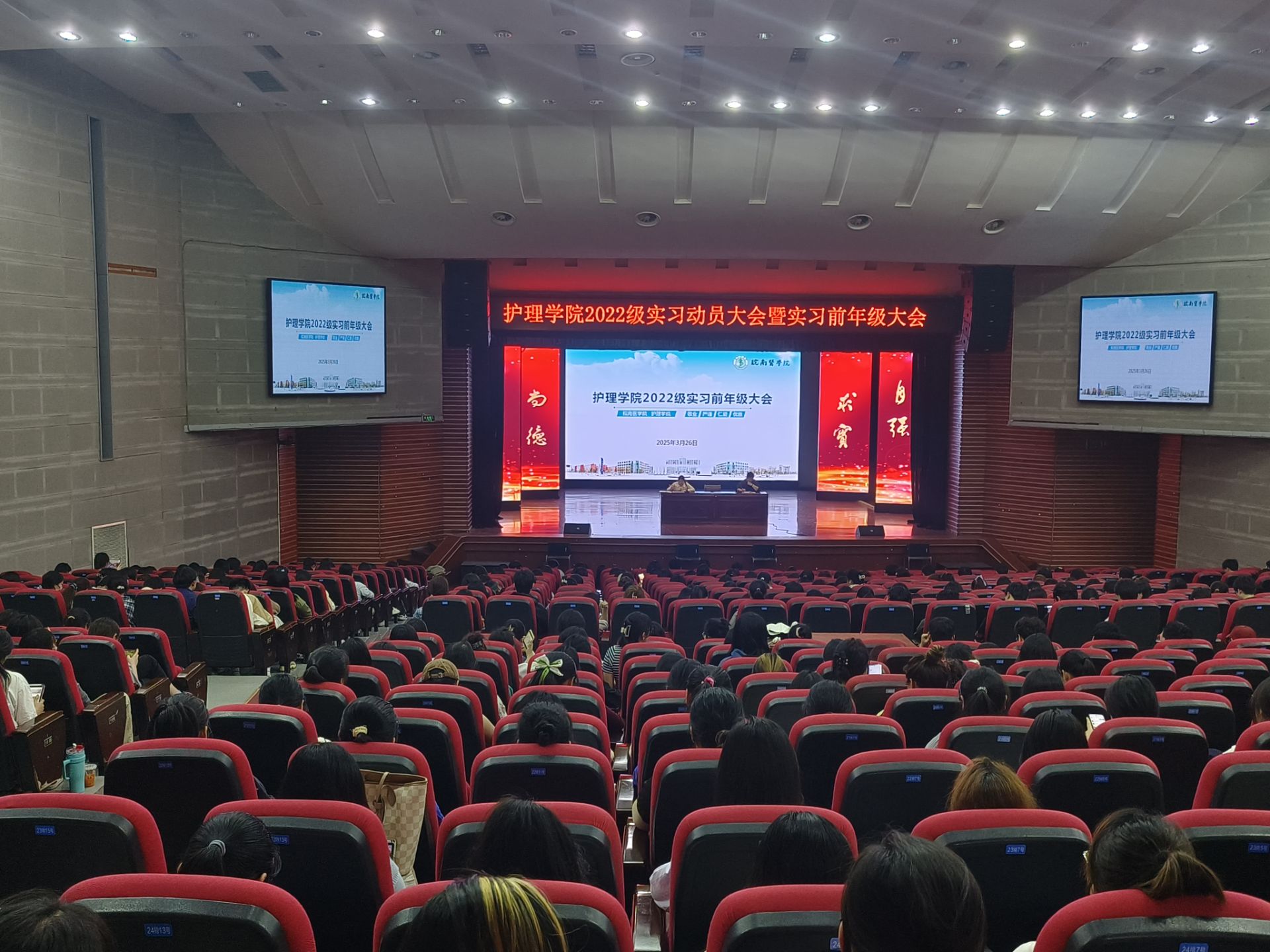 精准指导,广泛动员。为扎实做好学生实习工作,4月11日,护理学院在滨江校区大学生活动中心大礼堂召开实习动员大会,护理学院院长李远珍、副院长崔慧霞、年级辅导员及2022级全体学生参加会议。会上,李远珍强调了实践教学的重要性,围绕职业防护、安全教育、工作纪律等方面对同学们提出具体要求,勉励大家珍惜学习机会,端正学习态度,遵守规章制度,在实习岗位上砥砺素质、提升能力,为学院和学校增光添彩。崔慧霞详细解读了实习大纲中的科室轮转要求、实习管理制度、实习请假制度等,希望同学们转换角色快速适应,端正态度踏实学习,坚守初心笃志前行,以扎实的临床技能和温暖的人文关怀,答好这份关乎生命的青春考卷。年级辅导员强调了实习安全注意事项,提醒同学们尽快适应新环境,遵守实习单位规章制度,提前做好职业规划,树立正确的择业观和就业观,以饱满的精神状态投入新的学习阶段。