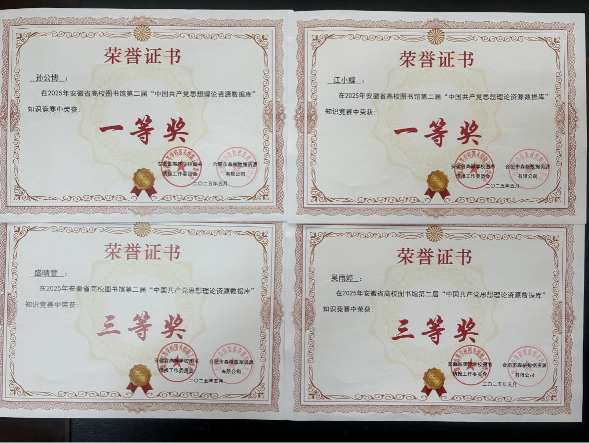 近日,由安徽省高等学校图书情报工作委员会主办的安徽省高校图书馆第二届“中国共产党思想理论资源数据库”知识竞赛评选结果揭晓,我校学子在比赛中脱颖而出,获一等奖2项、三等奖2项,其中孙公博同学更是取得全省第一名的优异成绩。