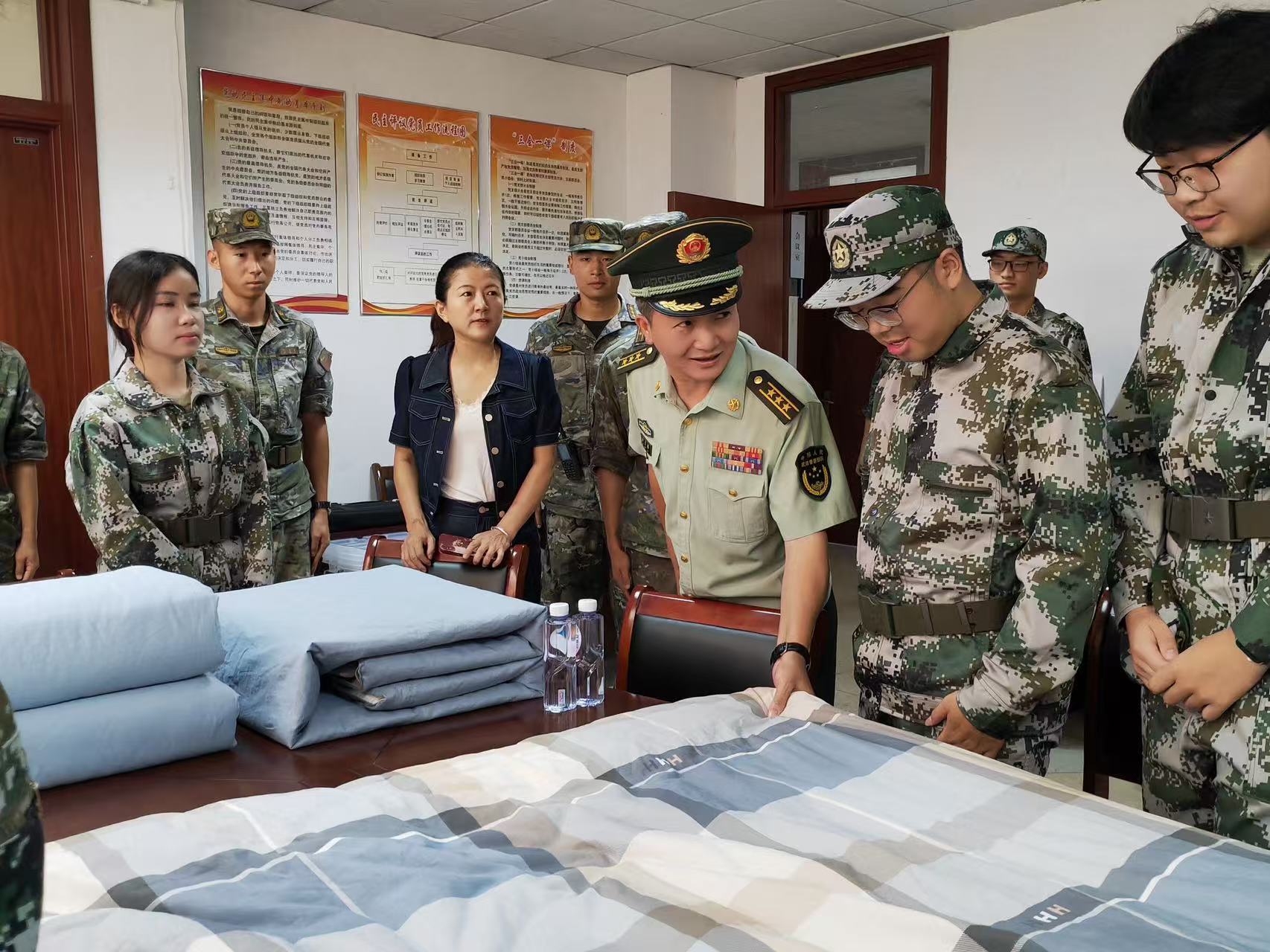 谢宏路、张建英一行深入军训内务整理现场,了解军训工作的进展与成效,并看望慰问参训学生及教官们。谢宏路对同学们展现出的良好精神风貌和军训成果给予高度评价,叮嘱同学们要增强国防观念和国家安全意识,注重培养良好行为习惯,增强集体荣誉感,树立爱国情怀。