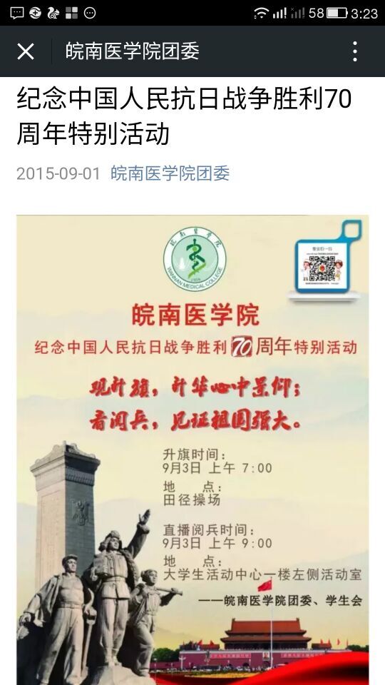 历史是人类最好的老师,和平是世界最大的希望。9月3日上午,纪念中国人民抗日战争暨世界反法西斯战争胜利70周年大会在北京天安门广场隆重举行,习近平主席发表重要讲话,阅兵仪式扬军威国威,万众期待,举世瞩目。我校师生医护员工高度关注,积极收看这一盛典实况,共同庆祝这一激动人心的神圣时刻。