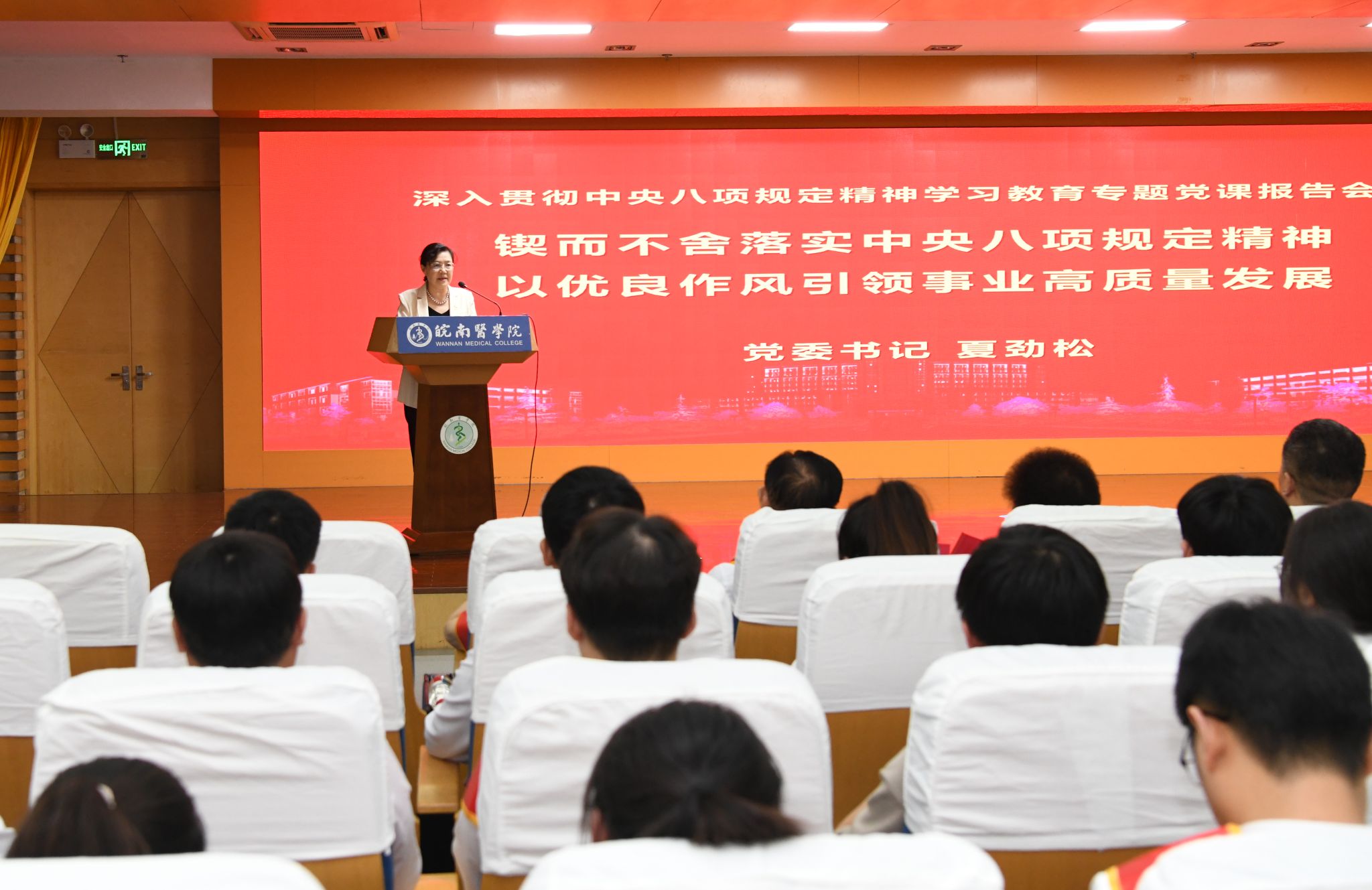 会上,夏劲松以“锲而不舍落实中央八项规定精神 以优良作风引领事业高质量发展”为题作专题党课。她从“深刻理解习近平总书记关于加强党的作风建设的重要论述”“贯彻落实中央八项规定精神所取得的成效经验”“以案为鉴,深刻认识违反中央八项规定精神的危害”“以作风建设新成效推动学校高质量发展”四个方面进行阐述,要求全校广大党员、干部把落实中央八项规定精神作为教书育人和治病救人的必然要求,改进党员和干部优良作风的重要抓手,推进学校改革发展的重要抓手,在学习上再深入,在查摆上再用力,在整改上再提标,不断提升党性修养、加强党的作风建设,推动校风教风医风学风持续向好,以更加饱满的热情、更加昂扬的斗志、更加进取的状态,立足本职、奋发有为,为早日建成“国内有影响、特色鲜明的区域性高水平医科大学”,为早日实现“教育强国”“健康中国”的战略目标作出新的更大的贡献。