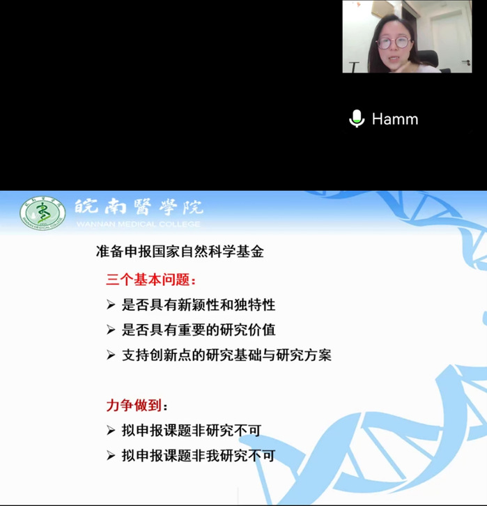 为做好2023年国家自然科学基金项目申报工作,提升基金申报数量与质量,积极推进学科发展,助力学校“更名大学”和“博士点立项建设”,12月3日下午,药学院在4号实验楼会议室召开第十七期药学学术沙龙暨国自然项目申报动员会。本次沙龙活动由学院院长韩军教授主持,邀请学院今年获批国自然面上和青年项目的车慧博士、黄慧丹博士分享申报经验与体会,药学院所有符合2023年国自然项目申报条件的50余名教师通过线上线下相结合的形式参会。