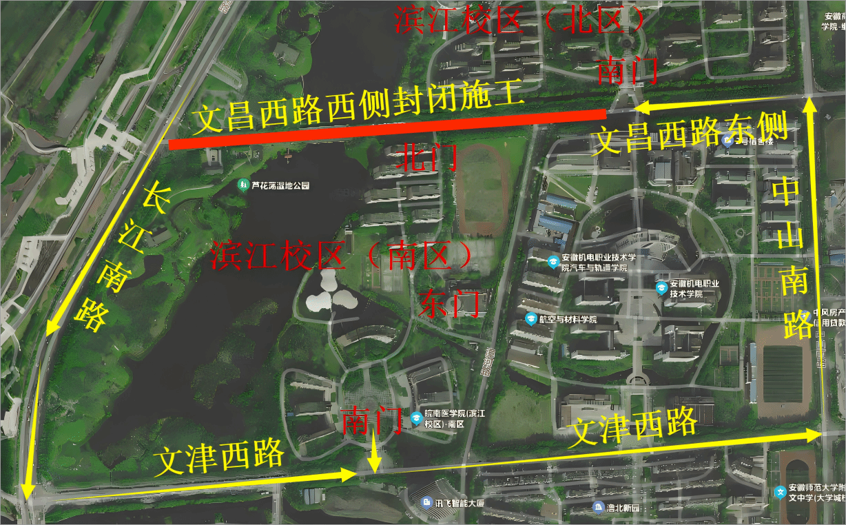 自10月22日至11月30日,滨江校区(北区)南门西侧路段至长江南路实行交通管制。12月1日起,该路段机动车道、非机动车道及人行道恢复通行。